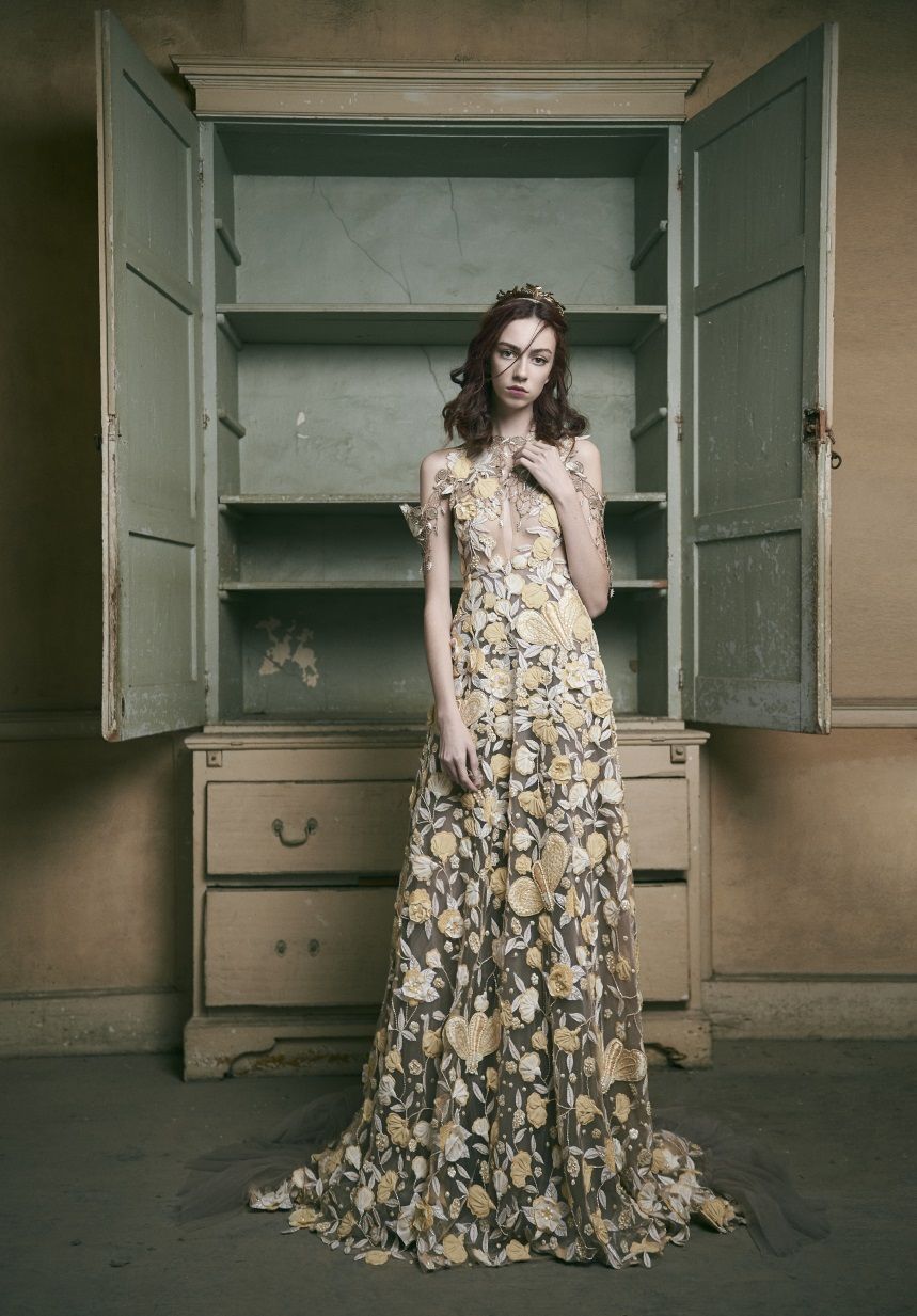 Los grandes protagonistas de esta colección son los tejidos vaporosos y los bordados en los diseños de volúmenes dispares. El contraste de colores en juego crea vestidos originales que nos recuerdan que cuando pasa el Invierno, la niebla se disipa del todo y el mundo vuelve a brillar ante nuestros ojos.