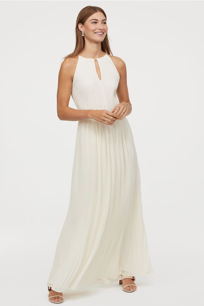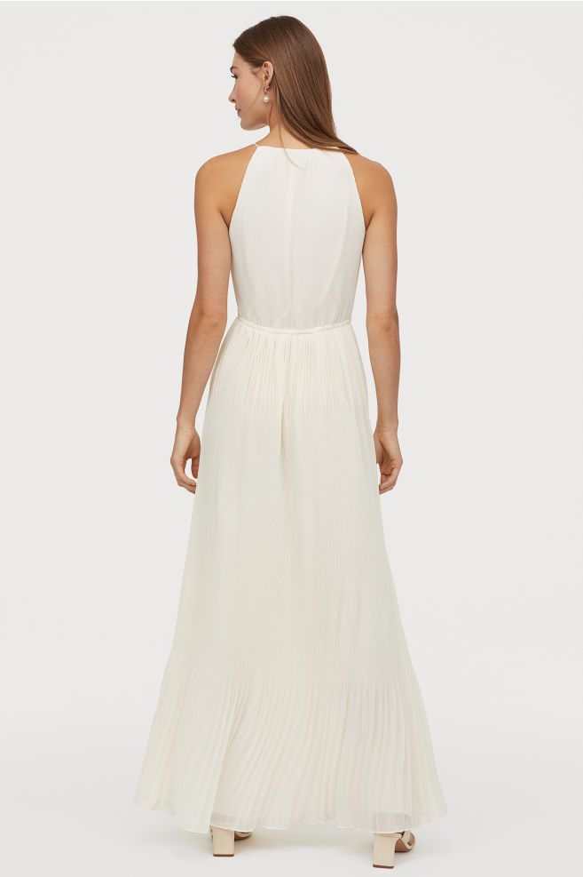Este vestido no es de su colección de novia, pero puede servir igual, es largo en tejido plisado con escote alto con abertura, costura elástica en la cintura y falda con vuelo.