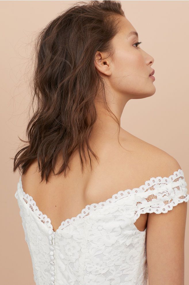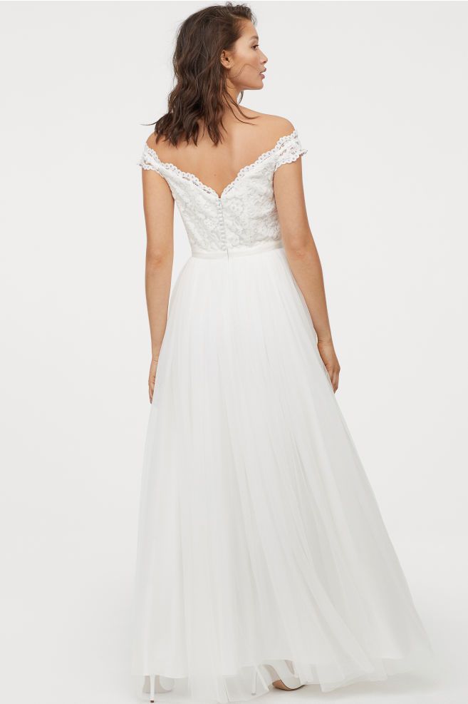 Vestido con cuerpo de encaje, hombros caídos al descubierto y falda de tul. Con escote corazón muy romántico tanto delante como detrás, Costura con lazo de grosgrain en la cintura y falda con varias capas de tul y satén.