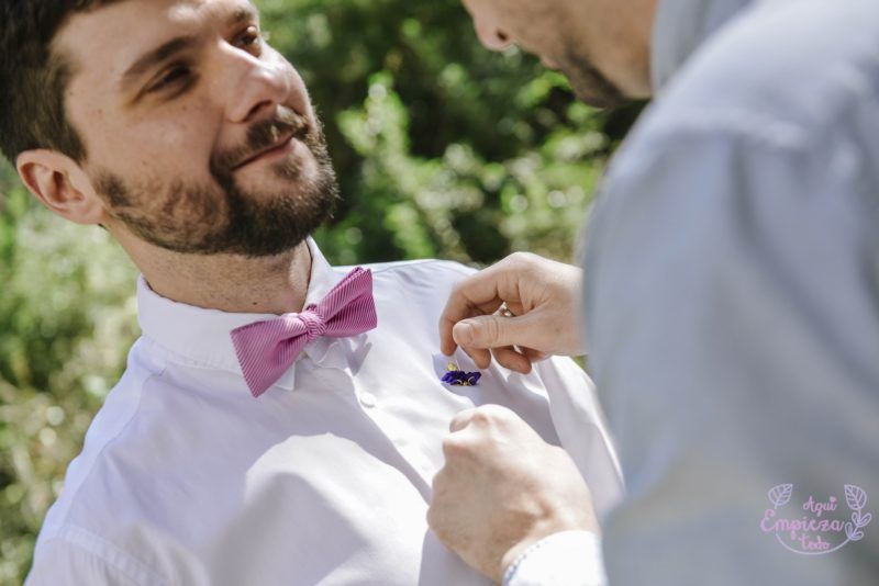 En mitad de la nada, rodeados de árboles teniendo como únicos testigos de su unión la vegetación del entorno. Los dos solos, sin agobios, sin prisas. Vistiéndose el uno al otro, disfrutando de cada segundo que pasan juntos. No necesitan grandes despliegues logísticos, ni mucha gente a su alrededor. Es un amor puro, sincero, entregado y sereno. No han tomado la decisión a la locura, simplemente ha llegado el momento de unirse todavía más y dar un nuevo paso en su relación, es una decisión consciente y meditada, no por imposición. Dejando de lado los protocolos, solo queriéndose a su manera, como ellos saben.
